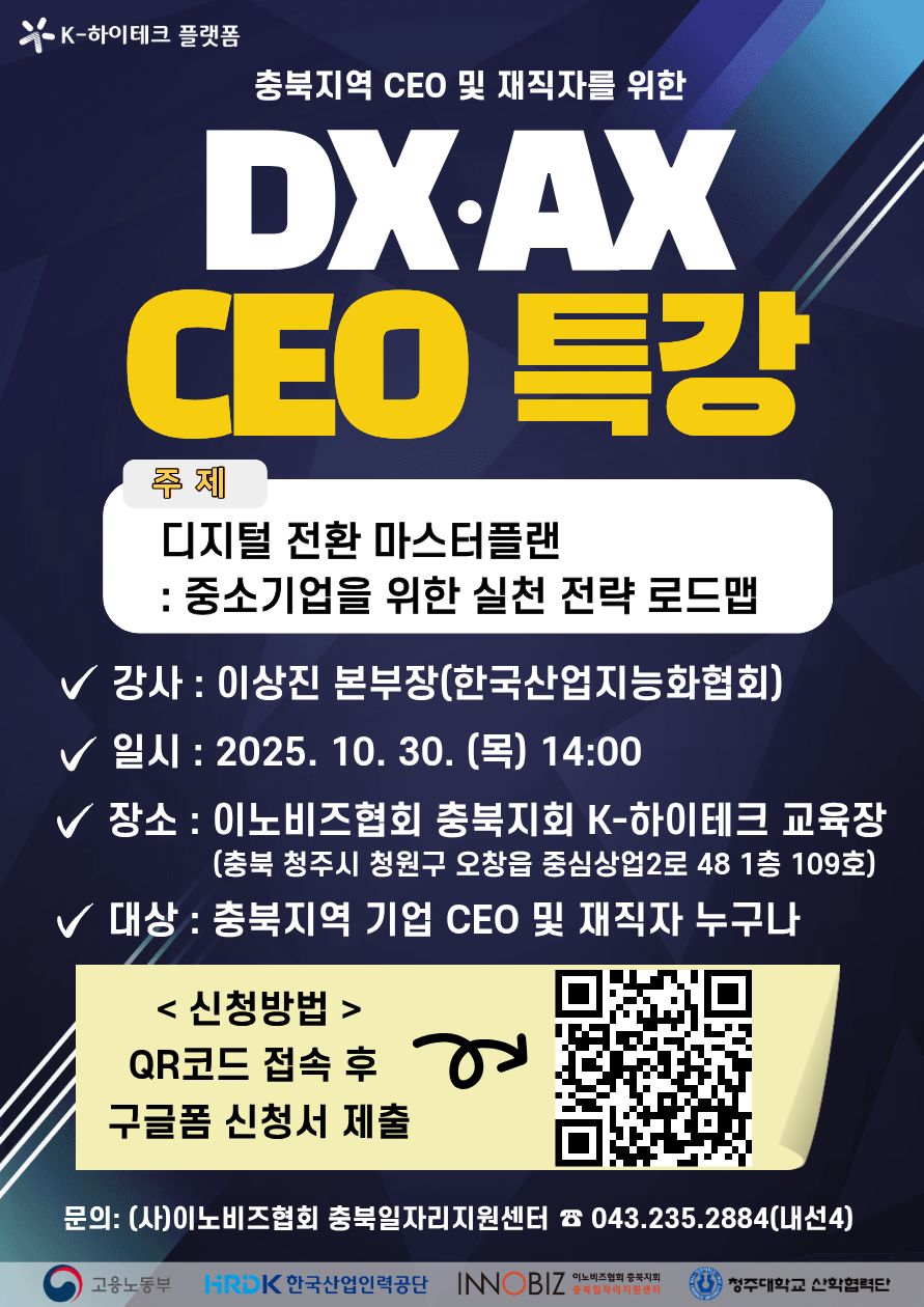 '25년 K-하이테크 플랫폼 사업'에서는 기업 CEO 및 재직자를 대상으로 'CEO를 위한 디지털·인공지능 전환세미나'를 개최합니다. 기업 CEO 및 재직자 여러분의 많은 관심과 참여 부탁드립니다. 일 시 : 2025.10.30.(목) 14:00 ~ 장 소 : 이노비즈협회 충북지회 K-하이테크 교육장 109호 (충북 청주시 청원구 오창읍 중심상업2로 48, 1층 109호) 대 상 : 충북도내 중소기업 CEO 및 재직자 주 제 : 디지털 전환 마스터플랜: 중소기업을 위한 실천 전략 로드맵 강 사 : 이상진 본부장(한국산업지능화협회) 신청링크 : https://forms.gle/E6Bnr6mrDJBmkoc66 |